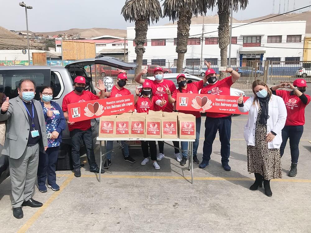 Jueves 8 de julio de 2021. La cadena de restaurantes Kentucky Fried Chicken (KFC) donó 300 colaciones a los trabajadores del Hospital Regional de Arica Dr. Juan Noé como parte de su campaña “Héroes sin capa”, que ha realizado estos aportes en hospitales públicos de todo el país como una forma de dar ánimo y reconocimiento a los funcionarios en tiempos de pandemia de covid-19.