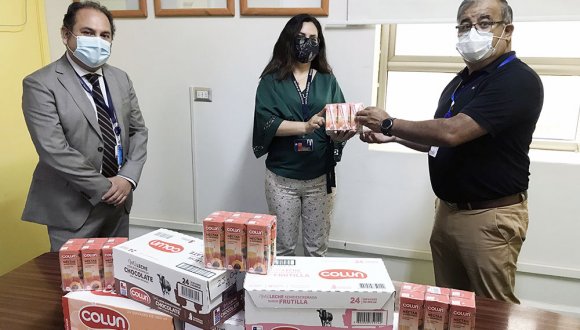 Arica, 23 de diciembre de 2020. La empresa Colun donó cerca de dos mil unidades de productos lácteos, consistentes en cajas individuales de leches y jugos, para el personal del Hospital Regional de Arica Dr. Juan Noé, como una forma de agradecer el trabajo que han llevado a cabo en la respuesta a la pandemia de covid-19 en Arica y Parinacota.