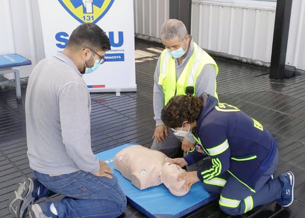 Arica, viernes 20 de mayo de 2022. La directora del Servicio de Salud Arica (SSA), doctora Magdalena Gardilcic, confirmó que una dupla de funcionarios de la base del Servicio de Atención Médica de Urgencia (SAMU) realizó una jornada de capacitación a los trabajadores de la empresa de logística y transporte MEDLOG en reanimación cardiopulmonar (RPC) y en el uso de los desfibriladores externos automáticos (DEA).
