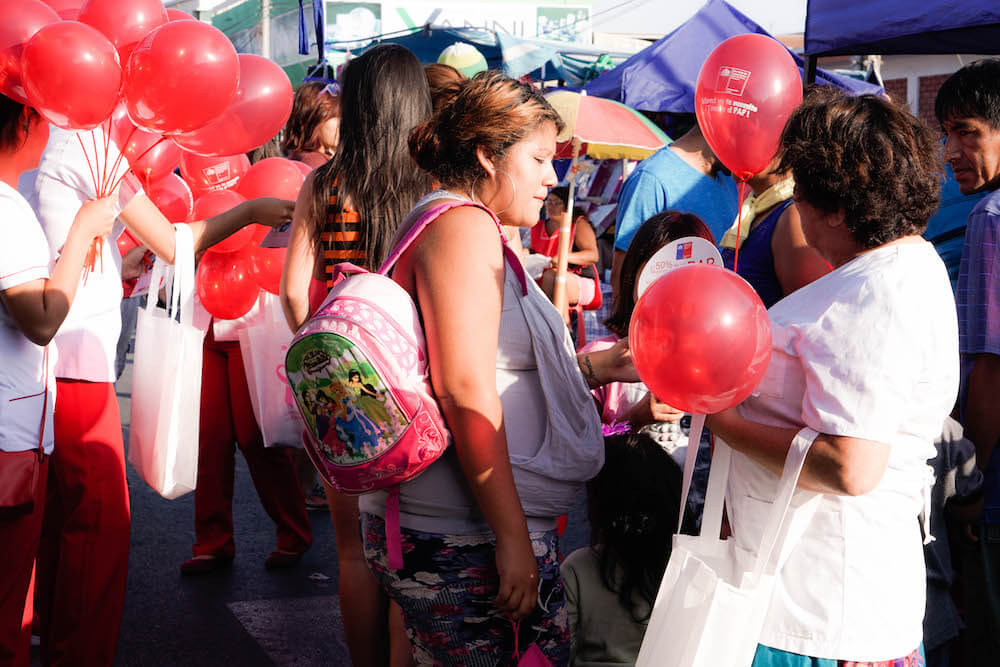 Con globos, abanicos y material informativo, la directora y matronas del Servicio de Salud Arica, junto a alumnas y alumnos de la carrera de obstetricia de la Universidad de Tarapacá, recorrieron la Feria Turística Dominical para informar a las mujeres sobre la importancia de realizarse el examen Papanicolaou (PAP) y también sobre la campaña de vacunación para prevenir el virus del Papiloma Humano.
