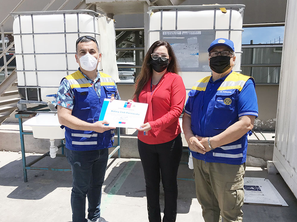 Ambos dispensadores de agua potable de mil litros, cada uno, para lavado de manos fueron devueltos por la directora (s) al presidente de la organización, Luis Béjares, quien, también, recibió un diploma de honor por esta gestión a favor de todos los habitantes de la Región de Arica y Parinacota.