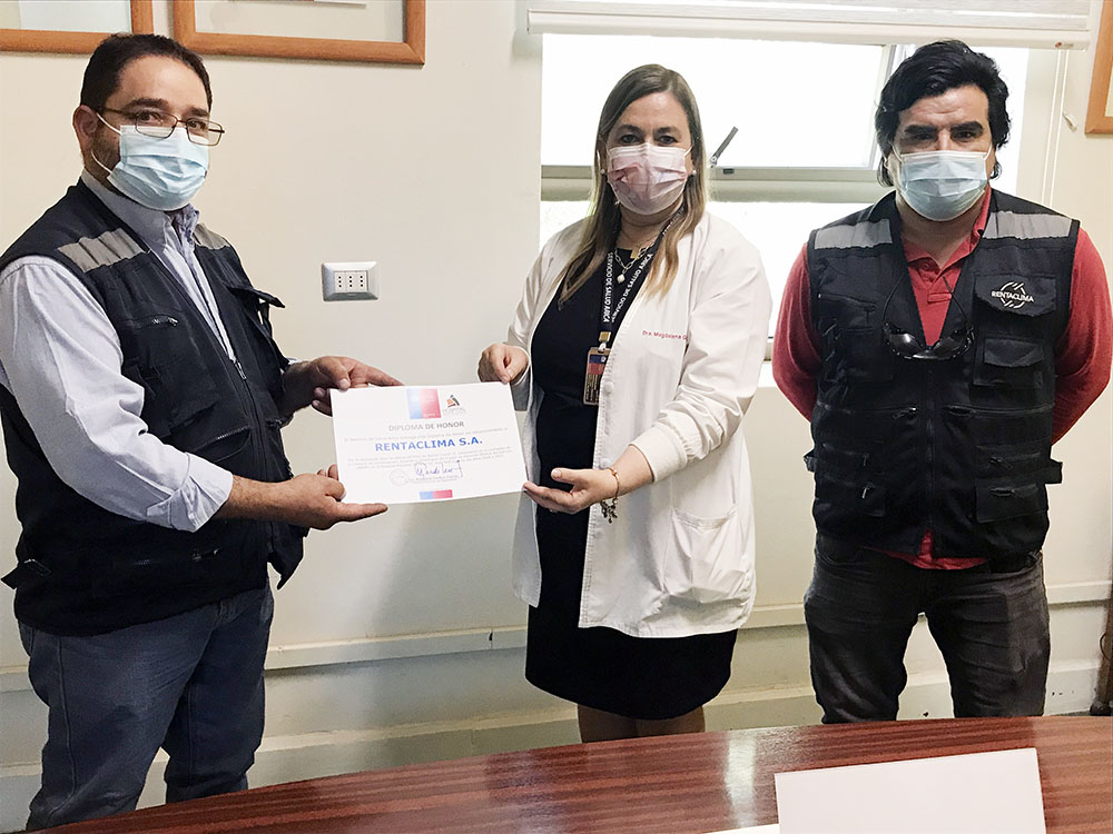 Arica, jueves 2 de diciembre de 2021. La directora del Servicio de Salud Arica (SSA), doctora Magdalena Gardilcic, agradeció el apoyo de la empresa Rentaclima S.A. que entregó en comodato un sistema de climatización para el puesto de atención médica del Ejército (PAME) que estuvo instalado en el Hospital Regional Dr. Juan Noé, en 2020 y 2021, como parte del plan de acción por la pandemia de covid-19.