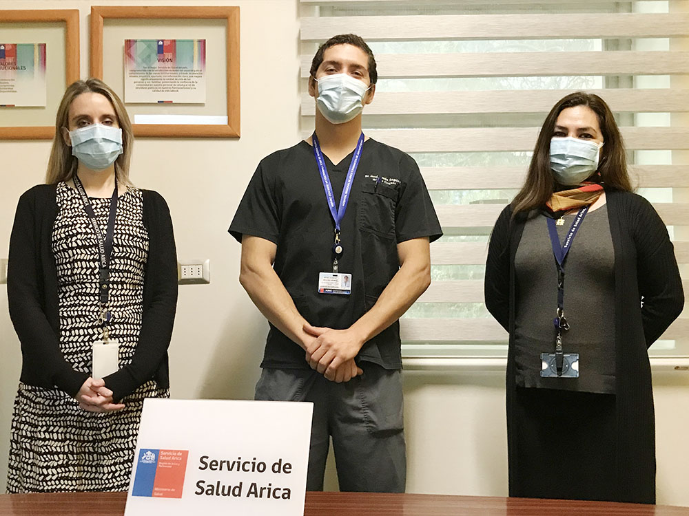 Arica, jueves 9 de junio de 2022. La directora subrogante del Servicio de Salud Arica (SSA), ingeniera Patricia Sanhueza, dio la bienvenida a dos nuevos médicos especialistas que se incorporaron, esta semana, a los equipos del Hospital Regional de Arica Dr. Juan Noé: la radióloga Pamela Miranda, contratación directa del establecimiento; y el ginecólogo José Seguic que inició su periodo asistencial obligatorio (PAO) luego de terminar una beca financiada por el servicio de salud.