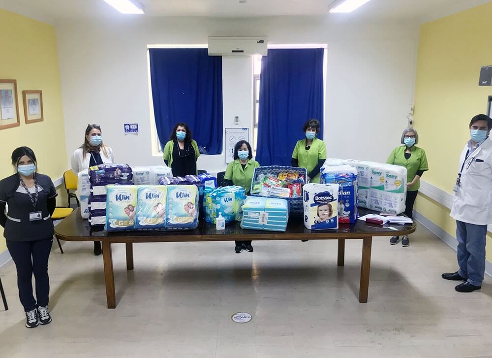 Arica, lunes 14 de junio de 2021. La unidad católica de acompañamiento espiritual (VOCAE) del Hospital Regional de Arica Dr. Juan Noé realizó una donación de más de 3 mil unidades de pañales, sabanillas, protectores de cama, camisas de dormir y útiles de aseo para los pacientes hospitalizados en dicho centro asistencial.